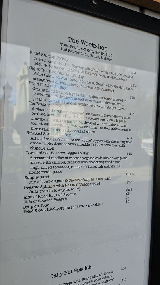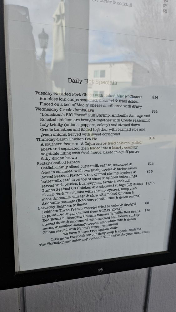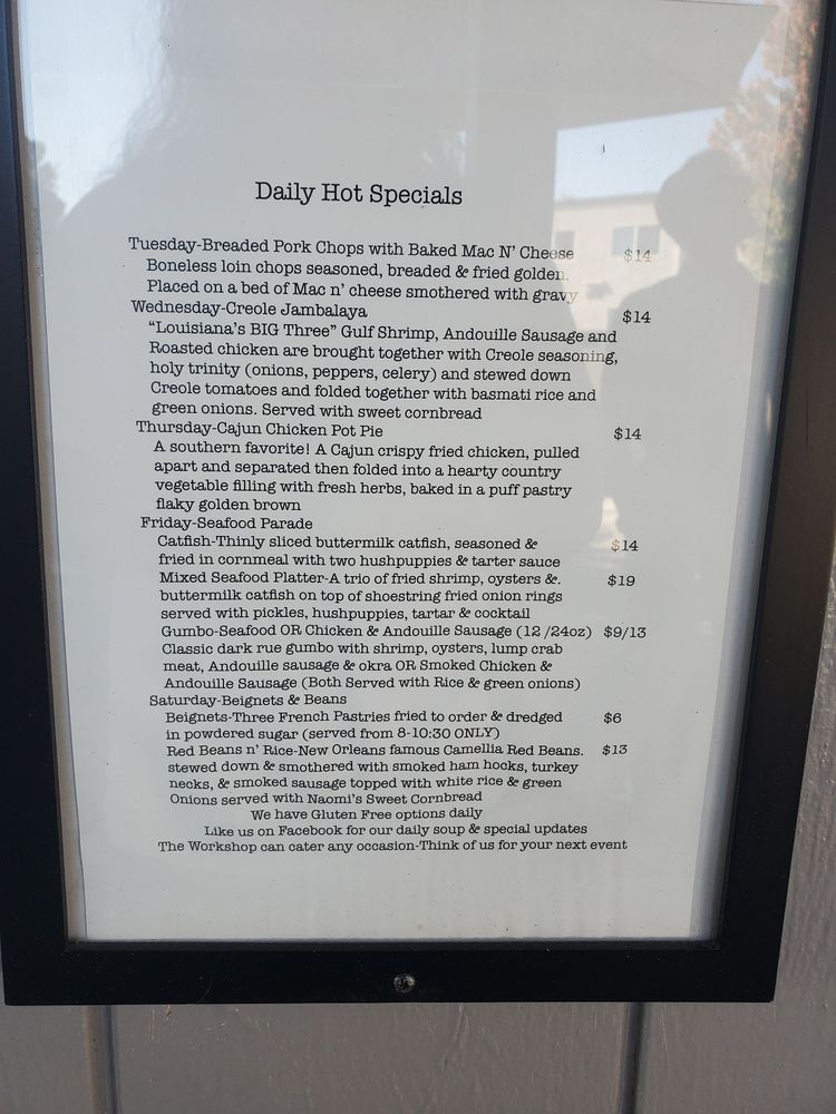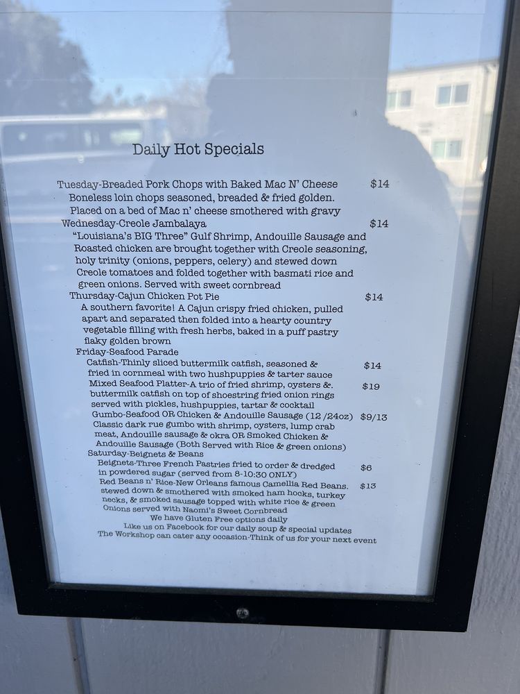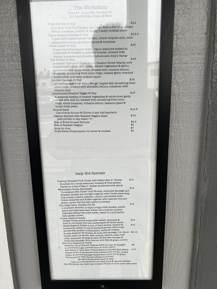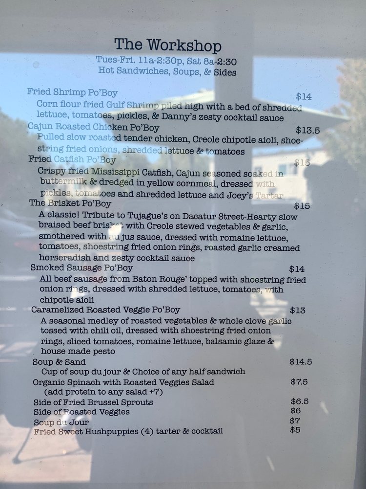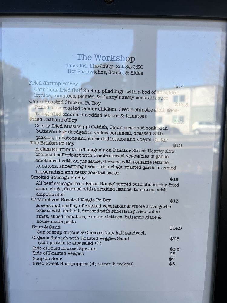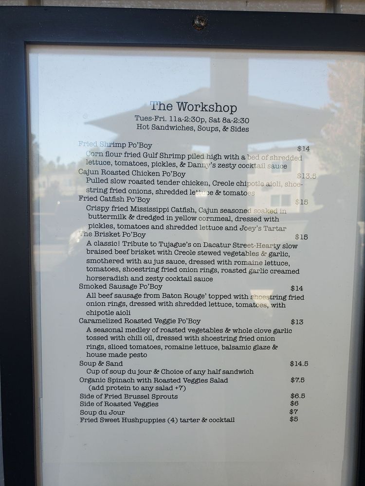 The Workshop in Benicia, CA, is a hidden gem offering a unique blend of Cajun/Creole, Southern, and Seafood cuisine. With a wide range of utilities like takeout, delivery, vegan options, and outdoor seating, it caters to various preferences. Customers rave about the shrimp po boy, oyster po boy, gumbo, and pot pie. The friendly owners and cozy ambiance make dining here a memorable experience. The fresh, made-to-order dishes, generous portions, and excellent service set The Workshop apart from other restaurants in town. Whether you're a fan of Cajun flavors or looking to try something new, The Workshop is a must-visit for top-quality food and a delightful dining experience.